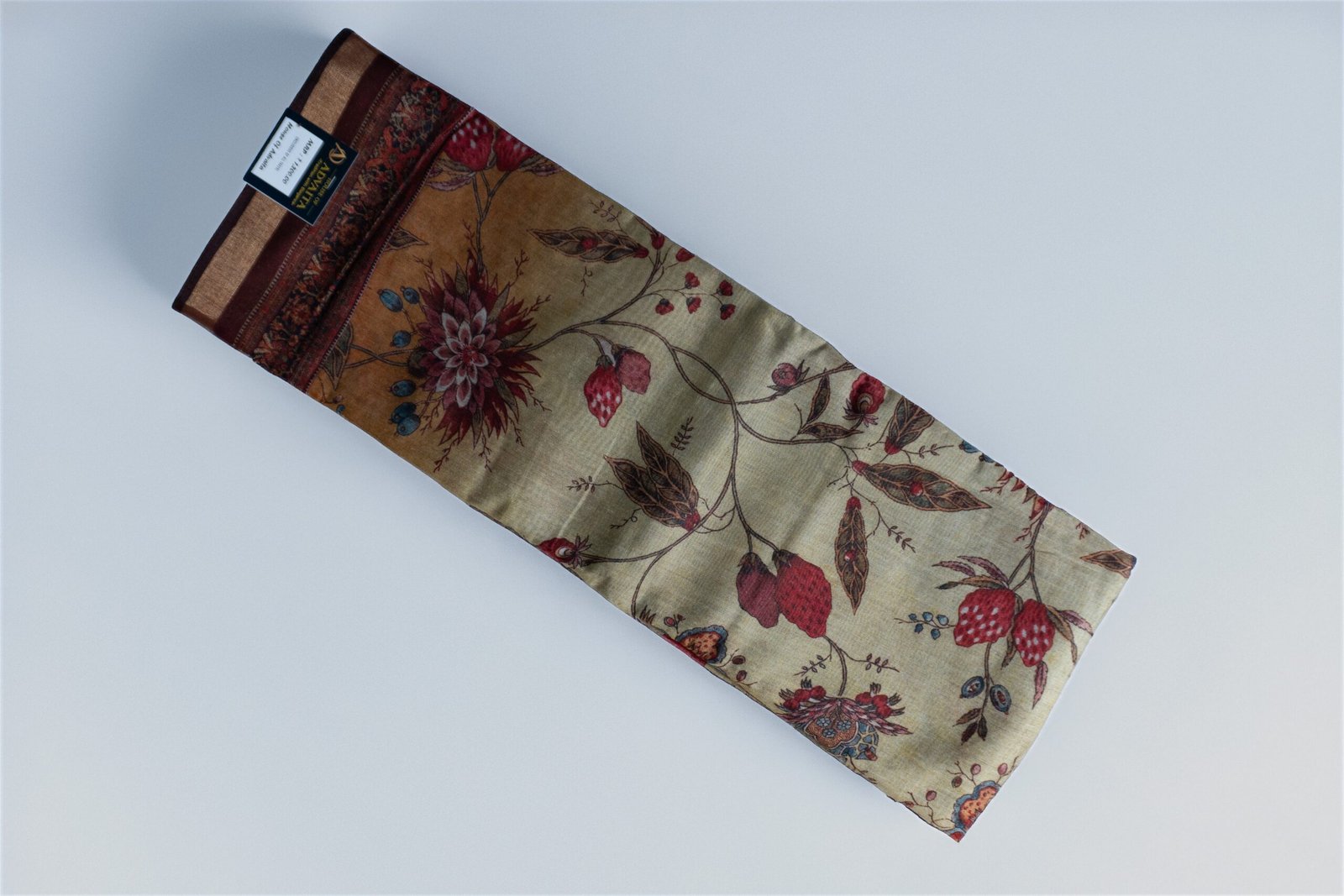 Digital Floral Print Chanderi Saree – Soft Beige with Rustic Maroon & Blue Accents