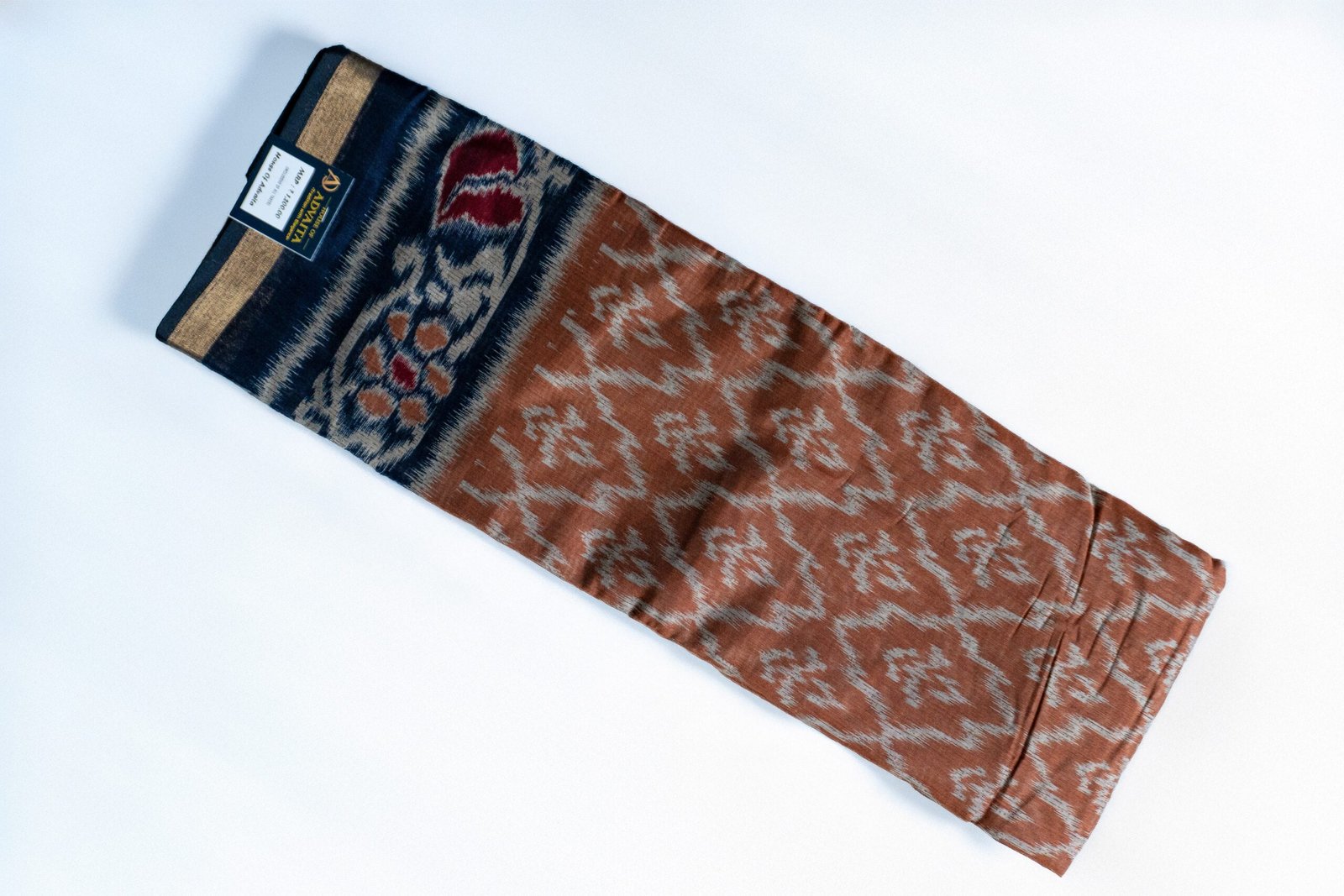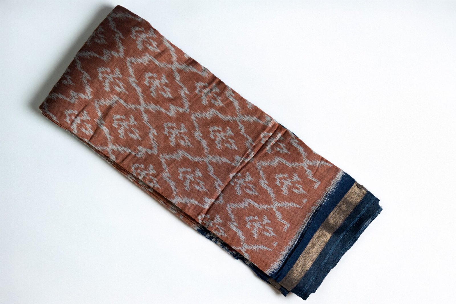 This elegant Ikkat Chanderi Saree features a rich terracotta brown base adorned with traditional ikat geometric motifs in soft grey. The saree carries a refined ethnic charm while remaining lightweight and comfortable—perfect for festive wear, office ethnic days, and casual traditional styling.