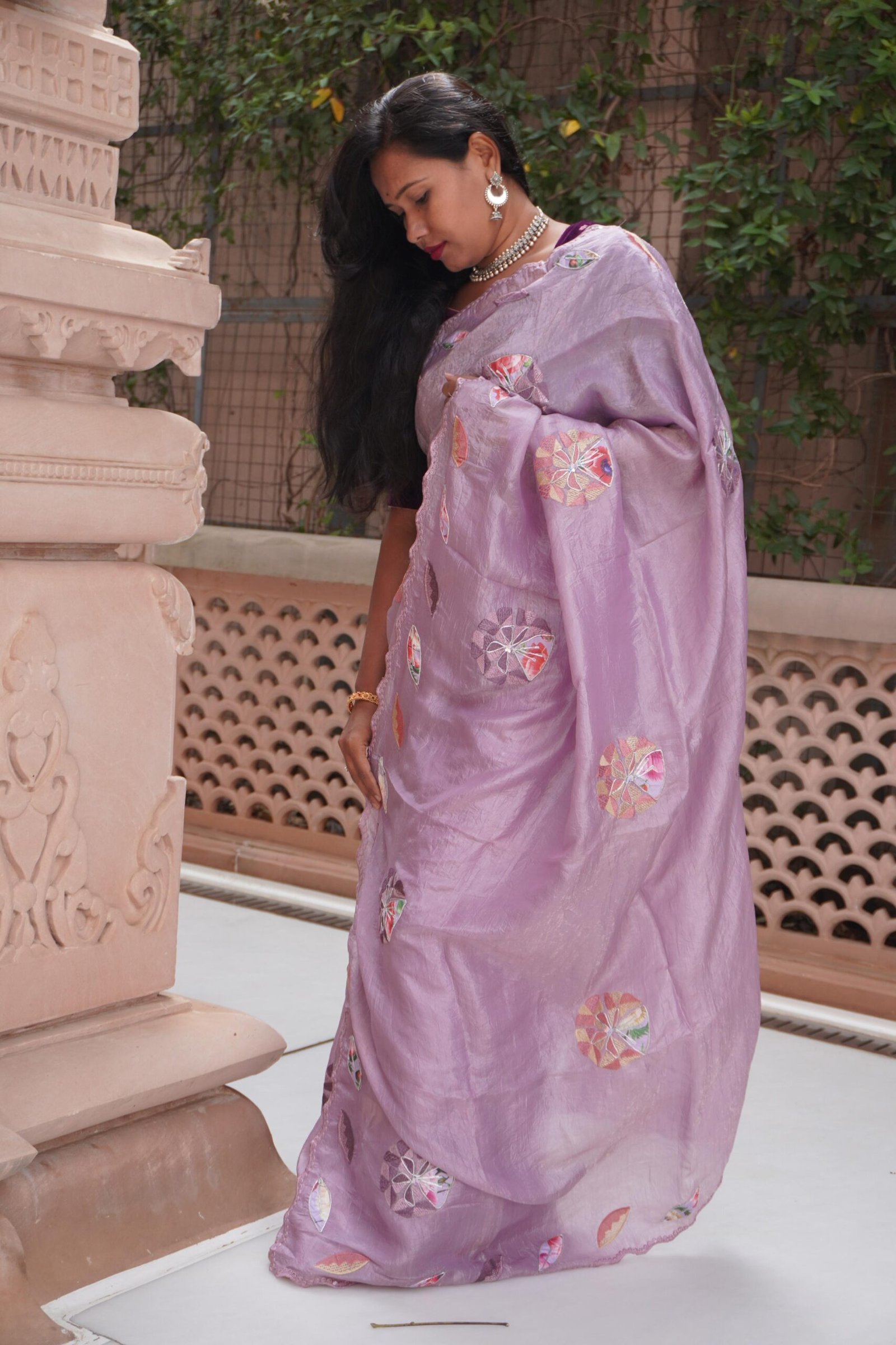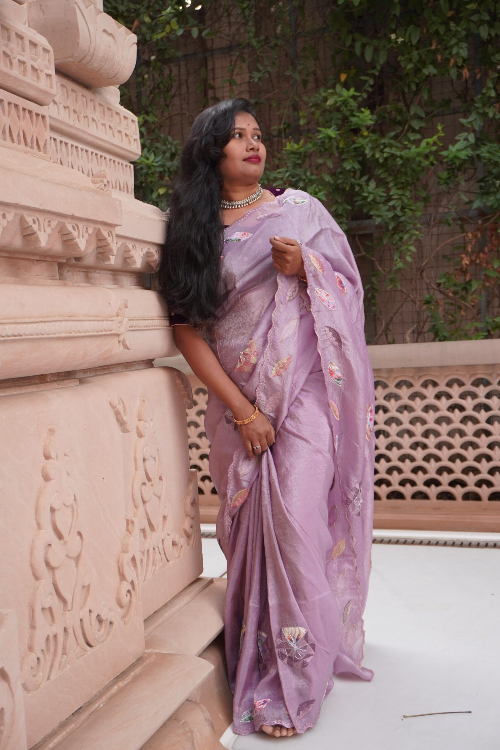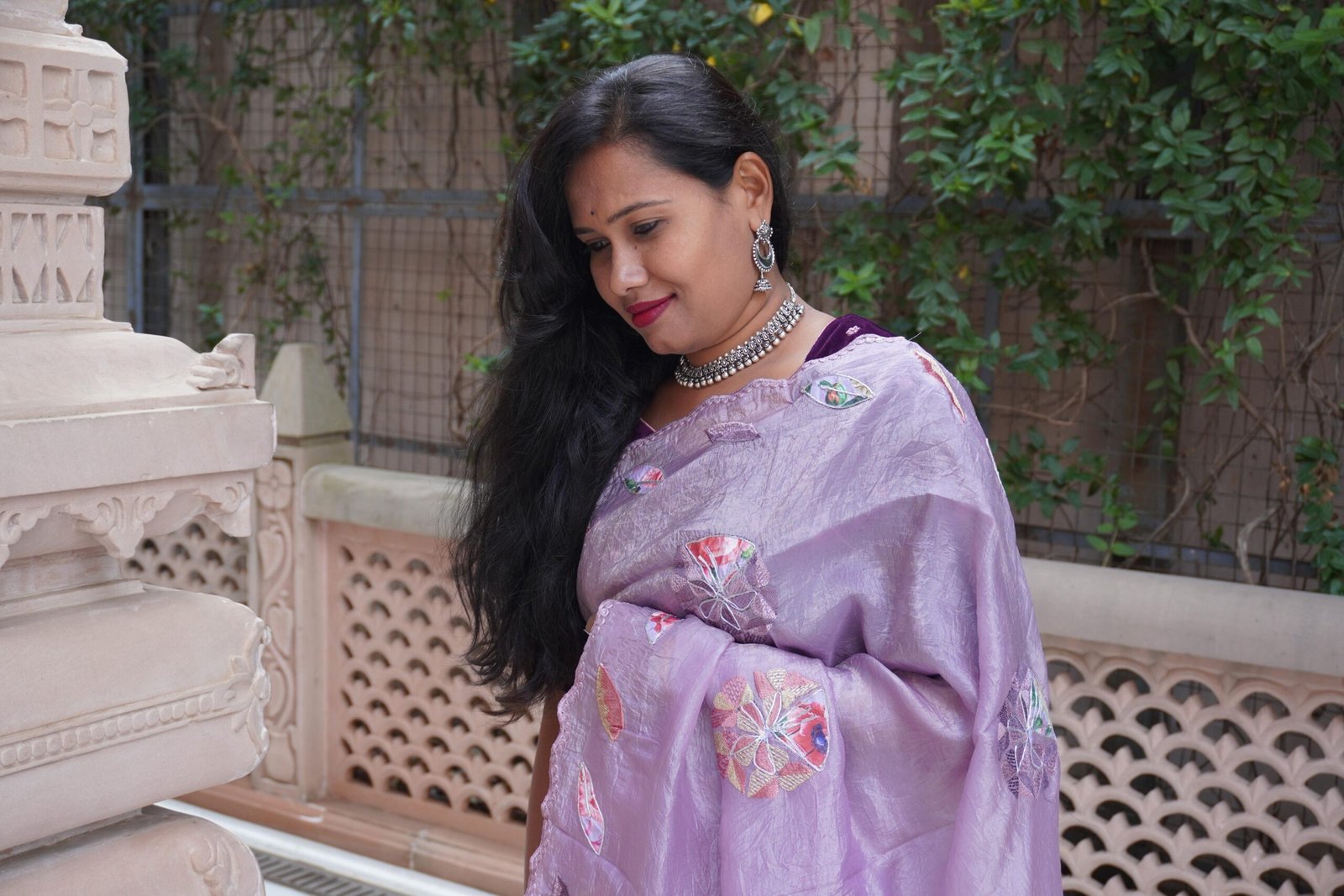 This saree is beautifully detailed with appliqué work motifs, adding a unique artistic touch and subtle contrast to the soothing onion pink base. The design strikes a perfect balance between traditional craftsmanship and modern aesthetics.