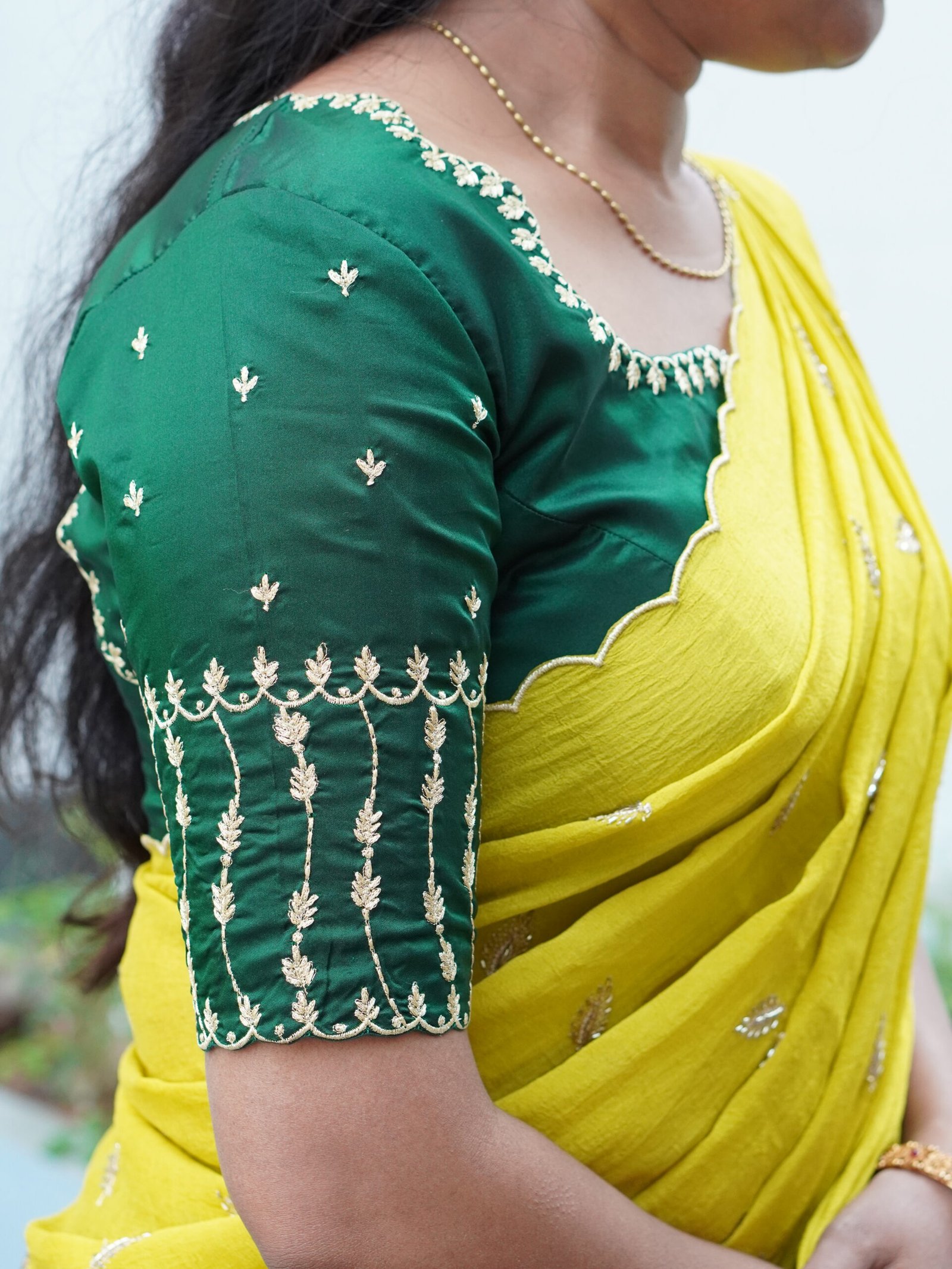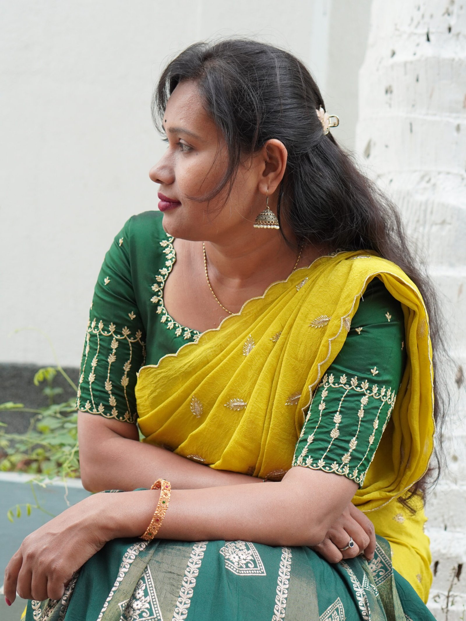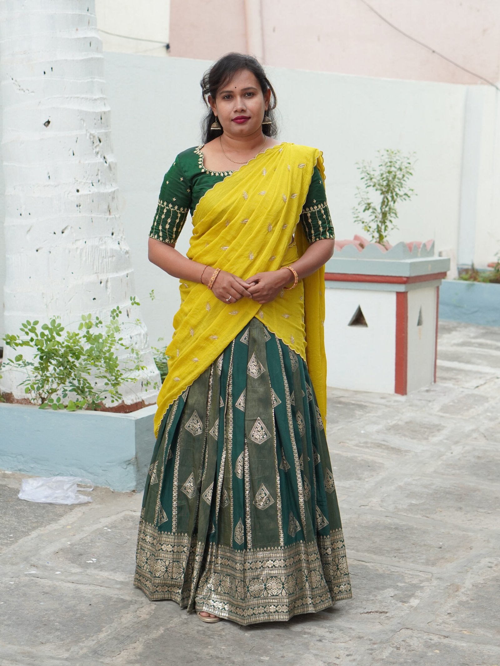 Rich emerald green Banarasi lehenga paired with a vibrant mustard yellow dupatta, crafted for a regal and festive ethnic look.