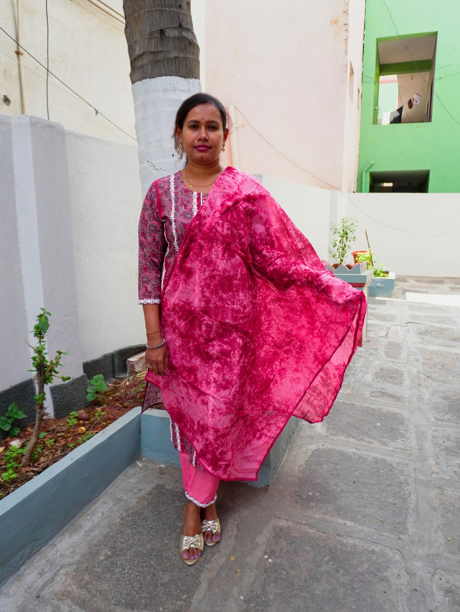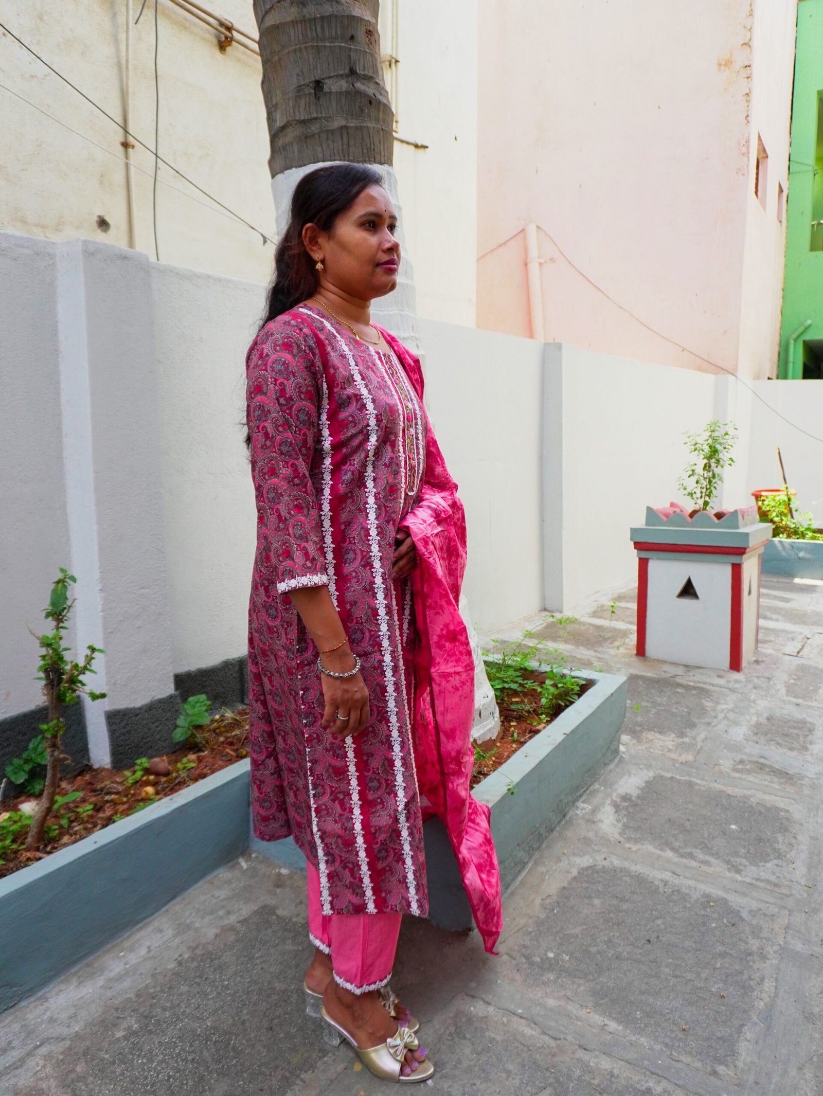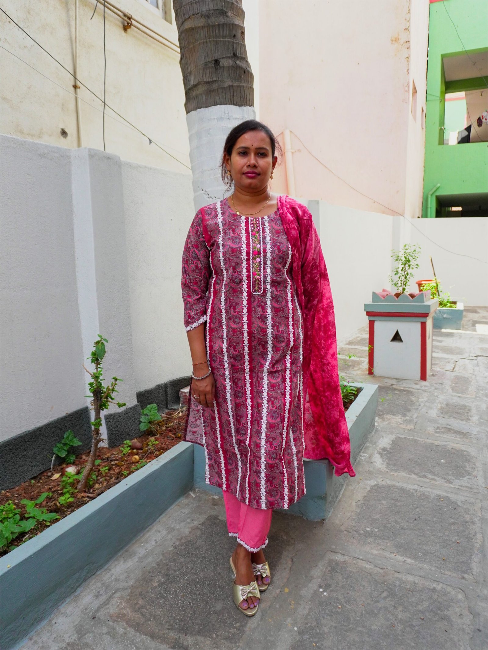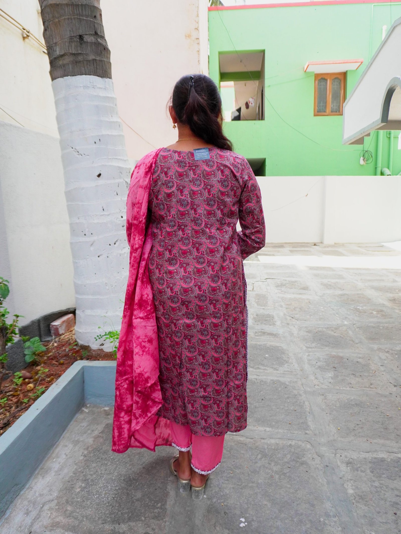 The deep maroon tones paired with subtle off-white detailing create a perfect blend of tradition and modern style. Crafted from breathable rayon cotton, the fabric feels soft on the skin and drapes beautifully. Completed with a matching dupatta and coordinated bottoms, this set is ideal for office wear, casual outings, and festive day looks.