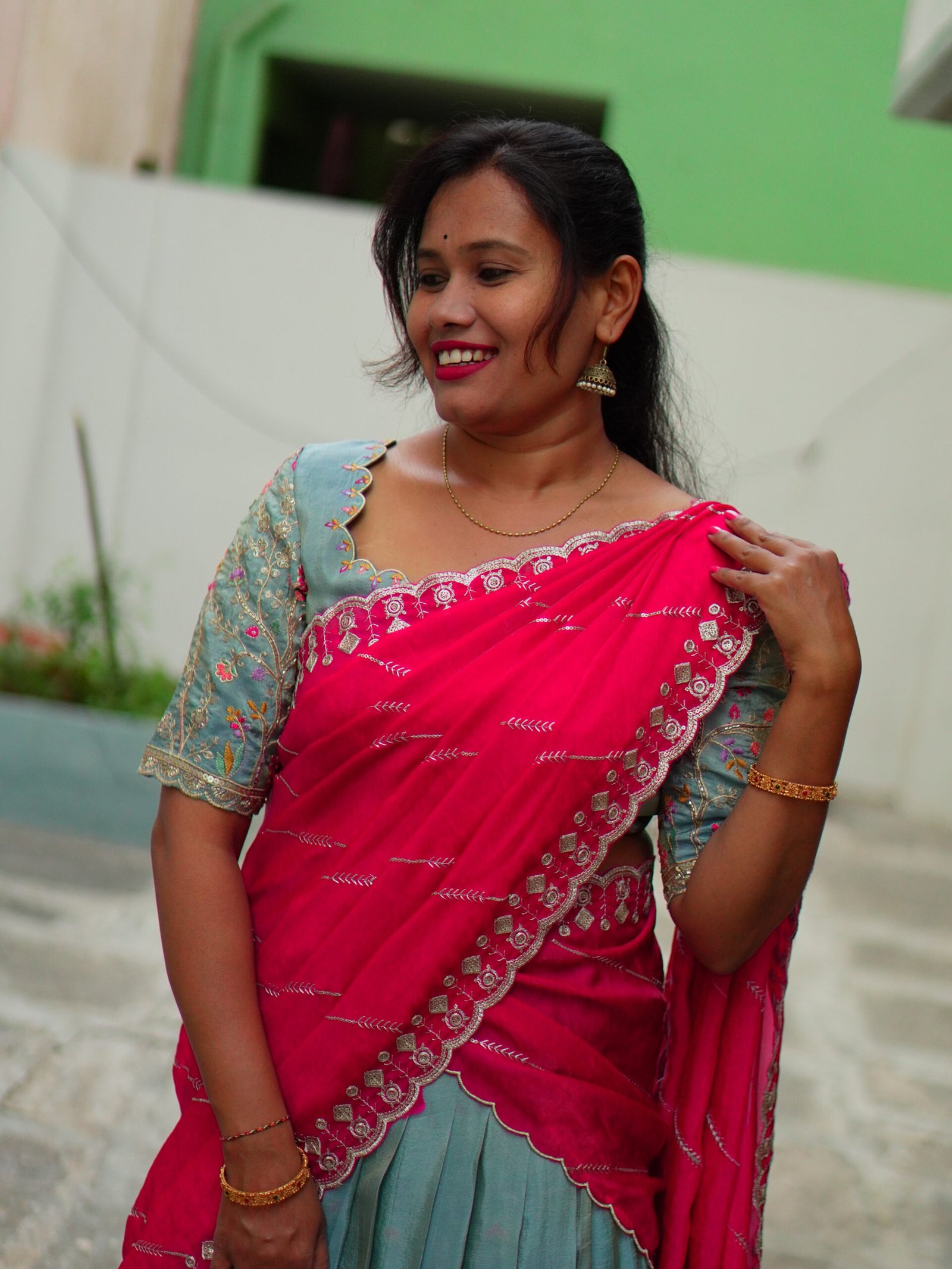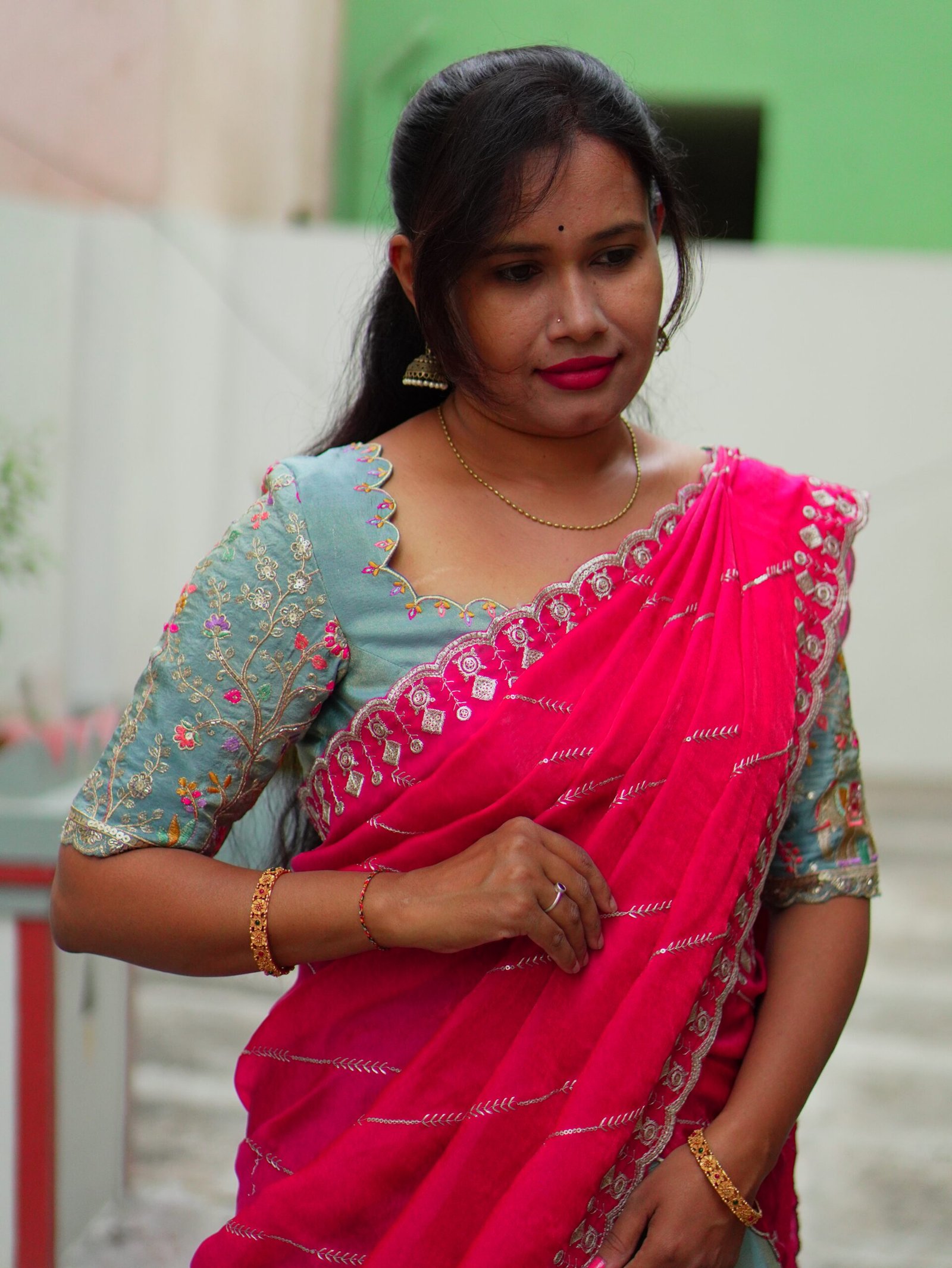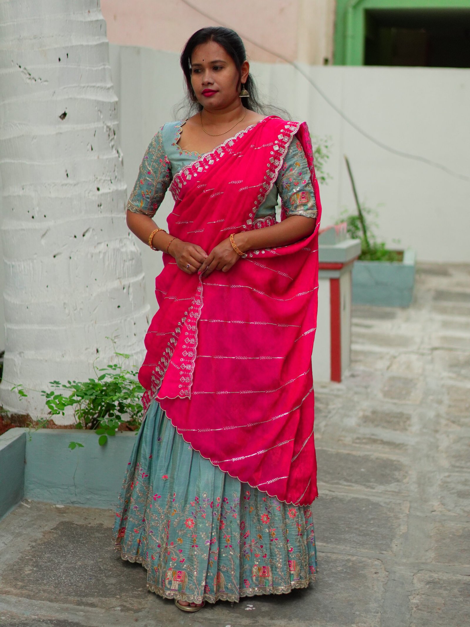 The highlight of this ensemble is the rani pink space silk shawl, which adds richness, contrast, and a statement appeal to the overall look. Paired with a coordinated blouse featuring intricate detailing, this outfit perfectly blends traditional craftsmanship with modern sophistication.