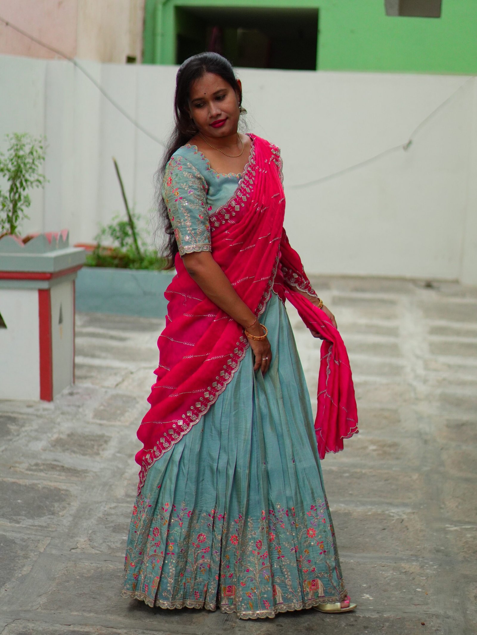 Be the first to review “Teal Blue Tissue Designer Lehenga with Rani Pink Space Silk Shawl”